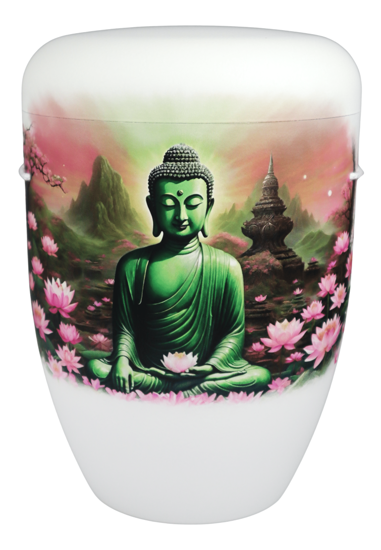 Urne - Buddha mit rosa Seerosen auf weiß matt|Kordel: weiß