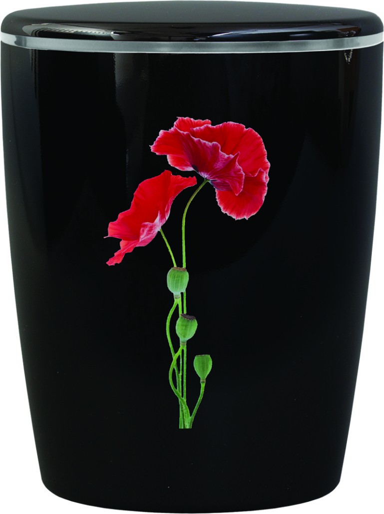 Urne wahlweise lackiert in schwarz oder weiß mit Mohnblumedekor (hochglänzend)