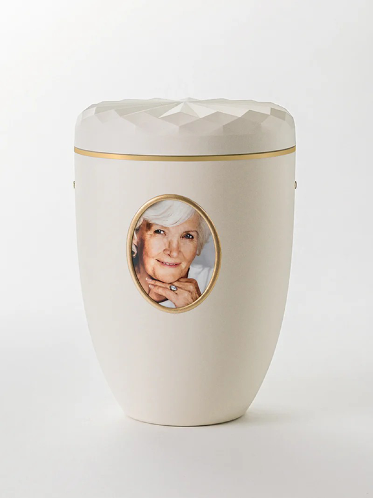Urne „Mohnkapsel“ cremeweiß | Urnen-Bilderrahmen, mit Bilderservice